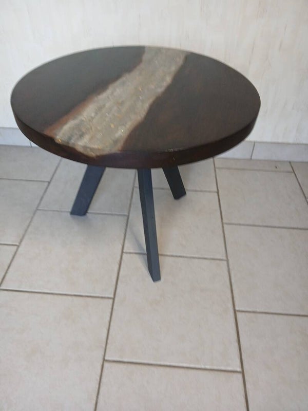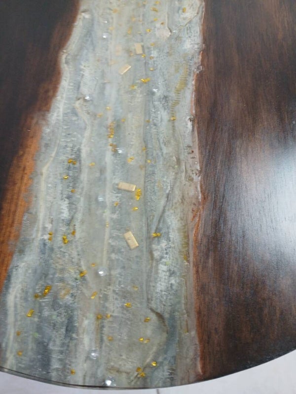 table basse en resine epoxy représentant un lit de rivière avec lingots et diamants. Le plateau fait 54 cm de diamètre et à une finition wenge