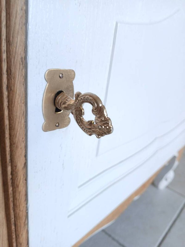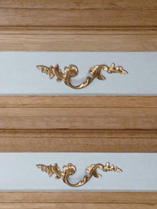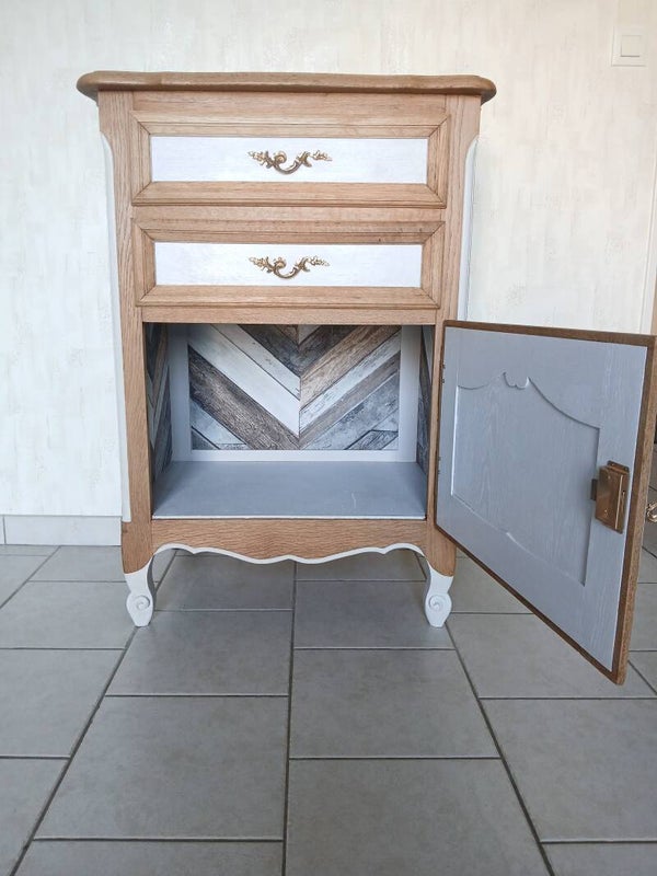 meuble entièrement restauré, mis à brut revêtu partiellement de gris très pale, mise en valeur des courbes. Papier peint chevrons. Jolies poignées dorées ajoutées.