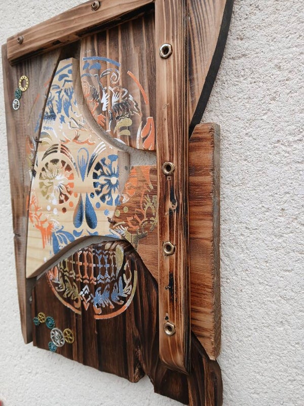 cadre fait de chutes de bois avec un pochoir crâne jouant avec plusieurs couleurs. Accessoires engrenages