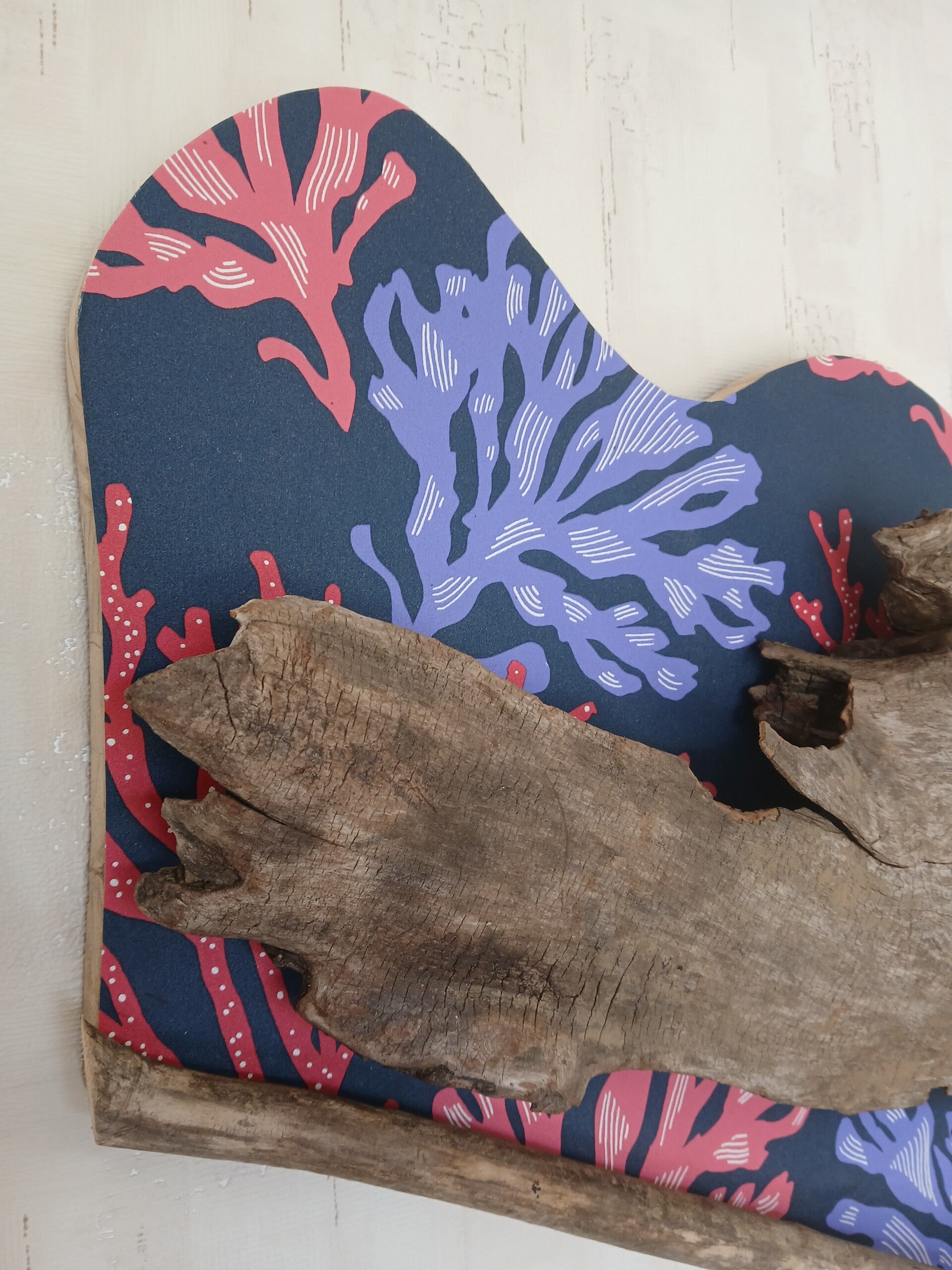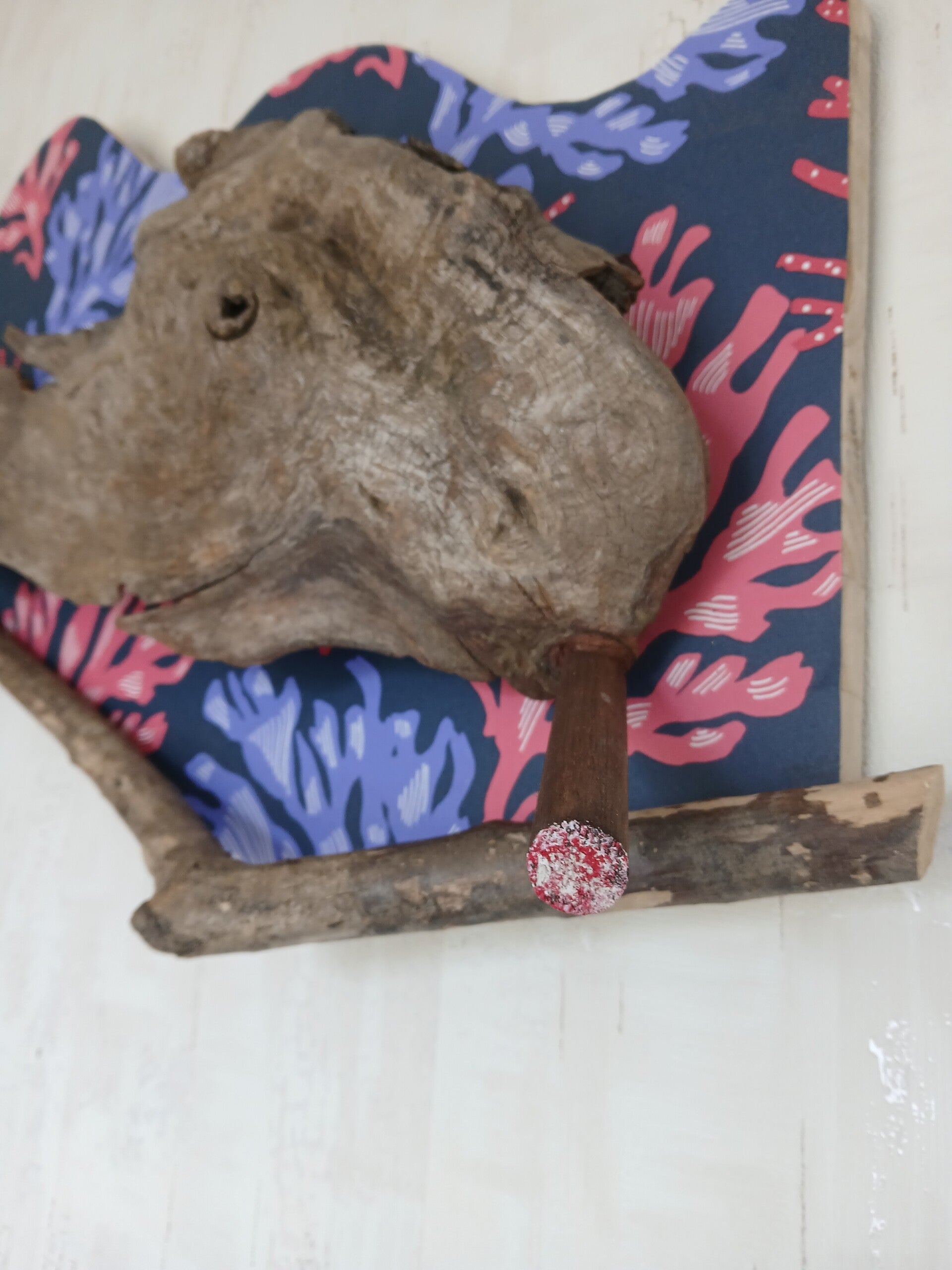 Morceau de bois flotté aux allures d’un poisson fumeur, ce petit cigare à la bouche lui donne su style, sur fond de papier peint algues