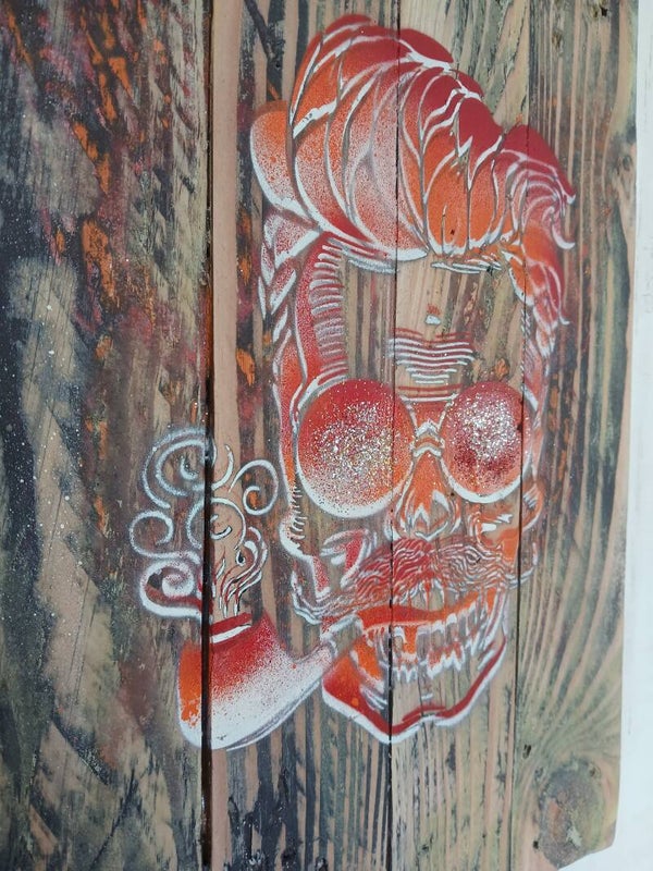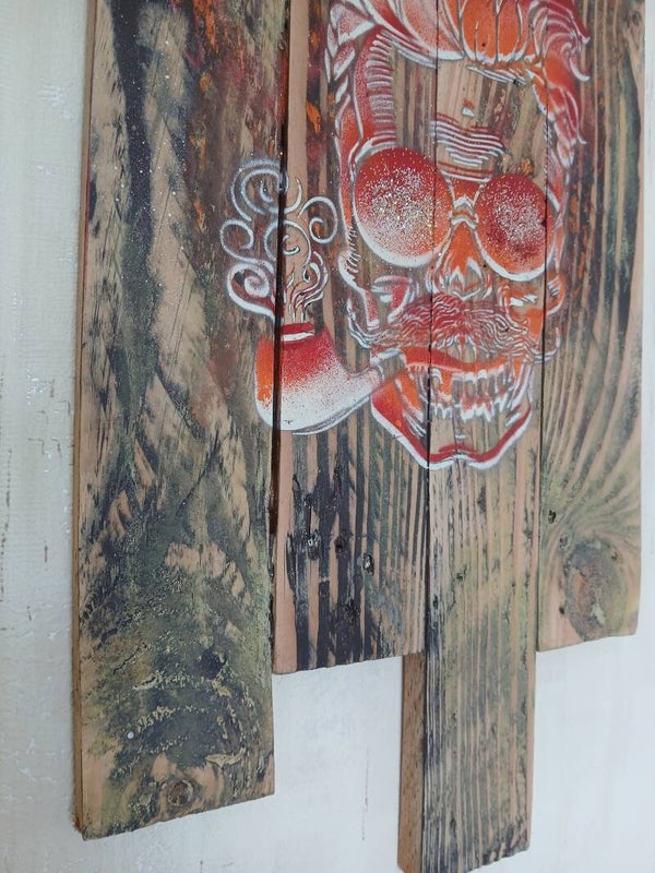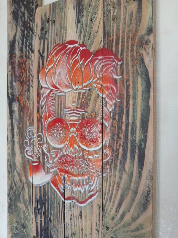 Lame de palettes formant un cadre asymétrique, pochoir de punk sur une base blanche avec des des effets oranges, rouges et les yeux pailletés lui font un joli regard.