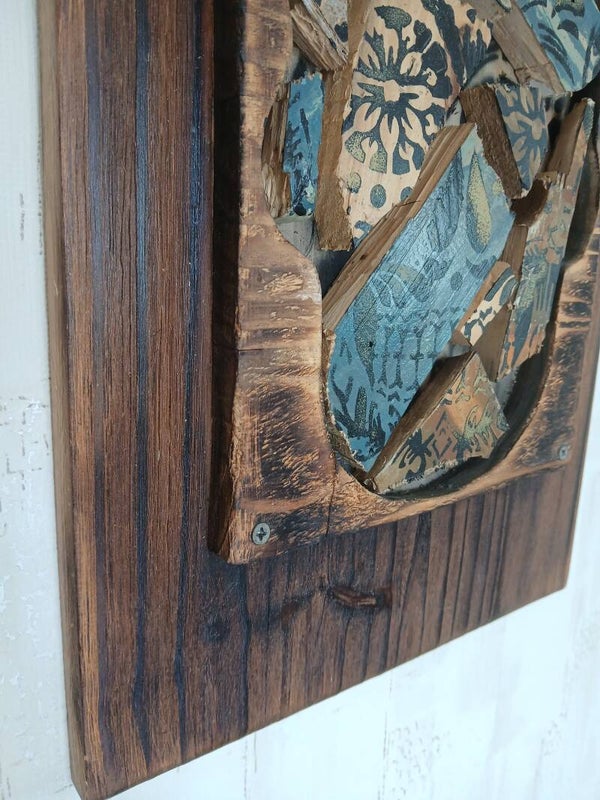 Forme du crâne découpé. Le vide est comblé par un pochage sous les morceaux de bois puis ceux-ci sont collés donnant une illusion de profondeur. La planche est brûlé puis brossée , formant des effets de vagues dans le bois