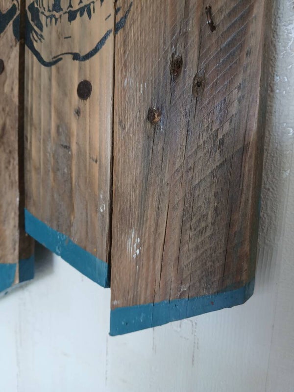 Lame de palettes assemblées formant un cadre aussi extrémités coupées et peintes en bleues.
