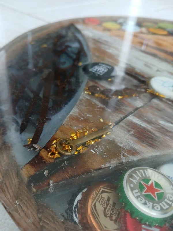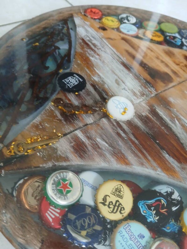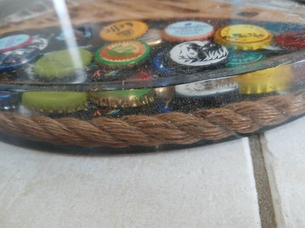 Plateau en resine epoxy mélangeant des capsules de bière. Les clous retirés des palettes, des chutes de bois. Un contour en corde.