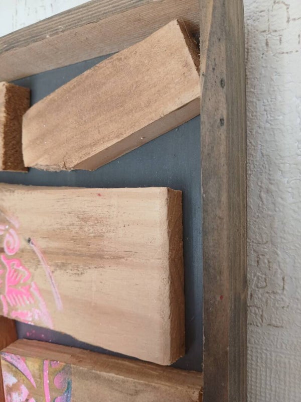Cadre fait de chutes de bois laissant apparaître un crâne sur celles-ci.