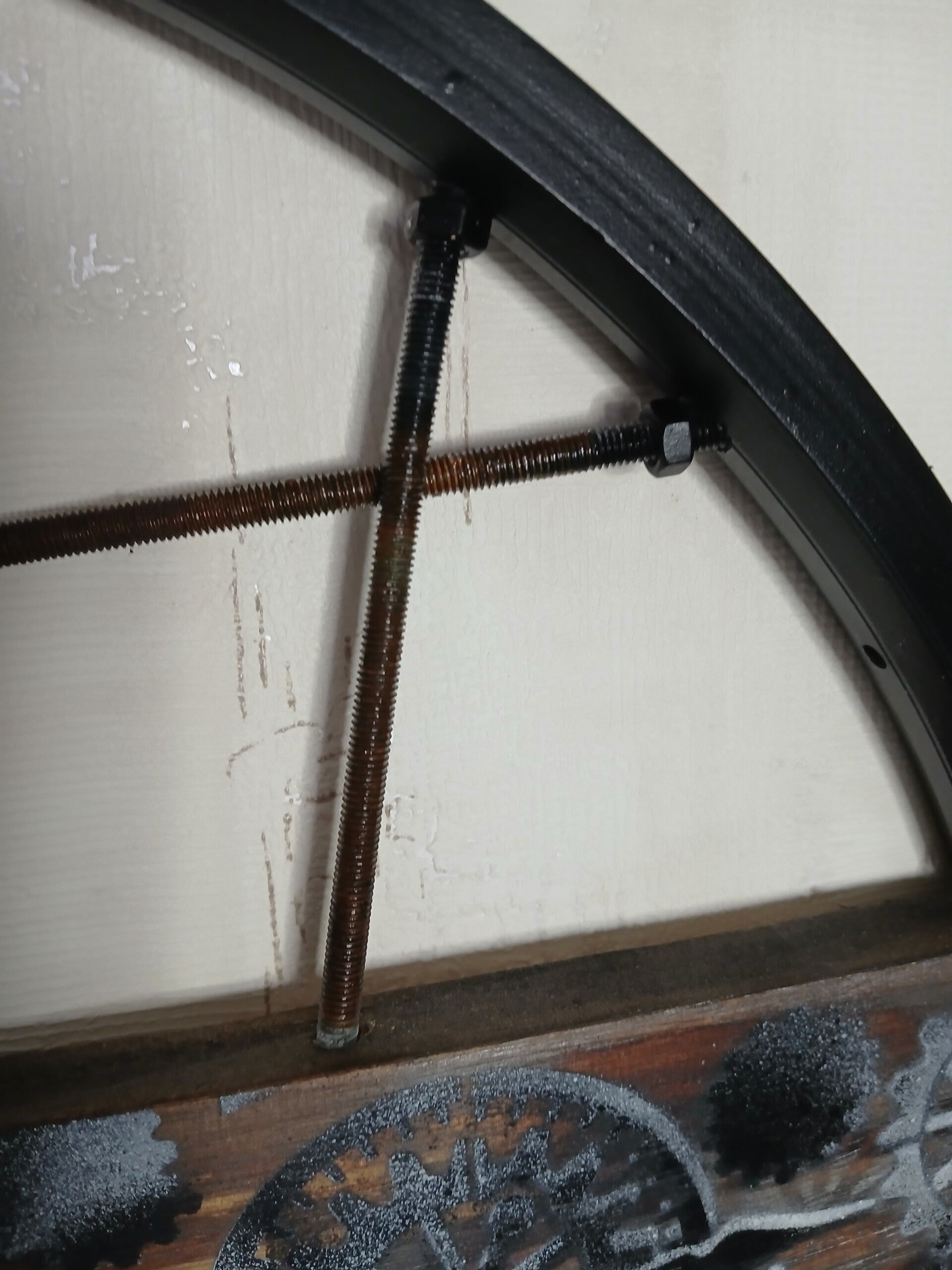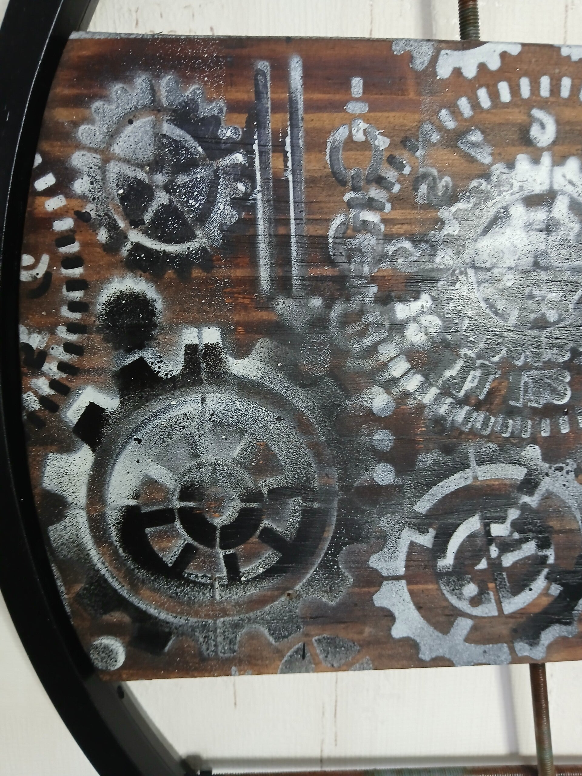 Cette roue de vélo à eu le droit à une seconde chance et voici une horloge. J’ai utilisé mes chutes de bois avec des pochoirs et des effets de dimensions avec le blanc et le noir, des tiges filetées que j'ai rouillée pour donner un côté graphique. Les aiguilles peintes en rappel des couleurs des engrenages.