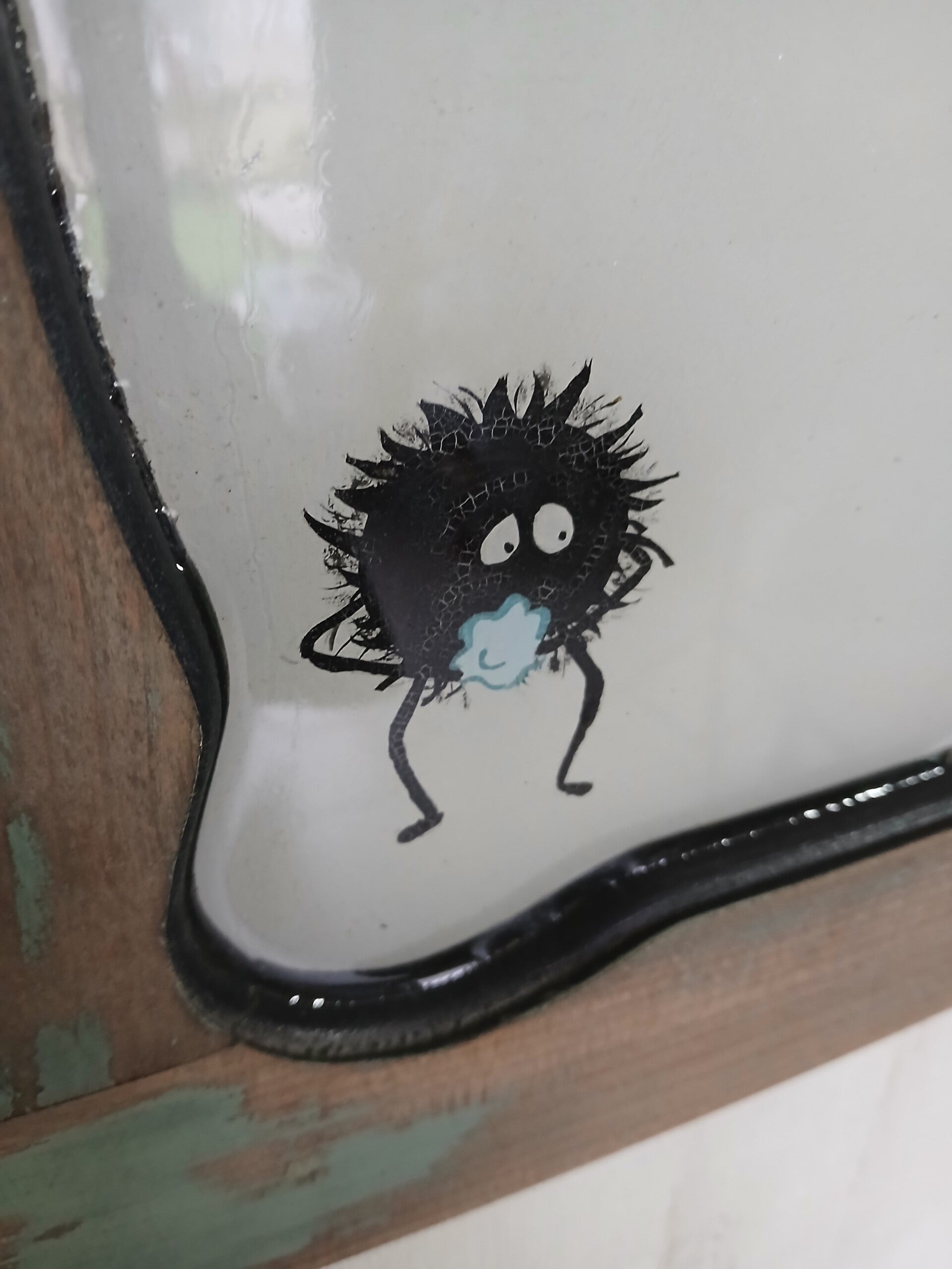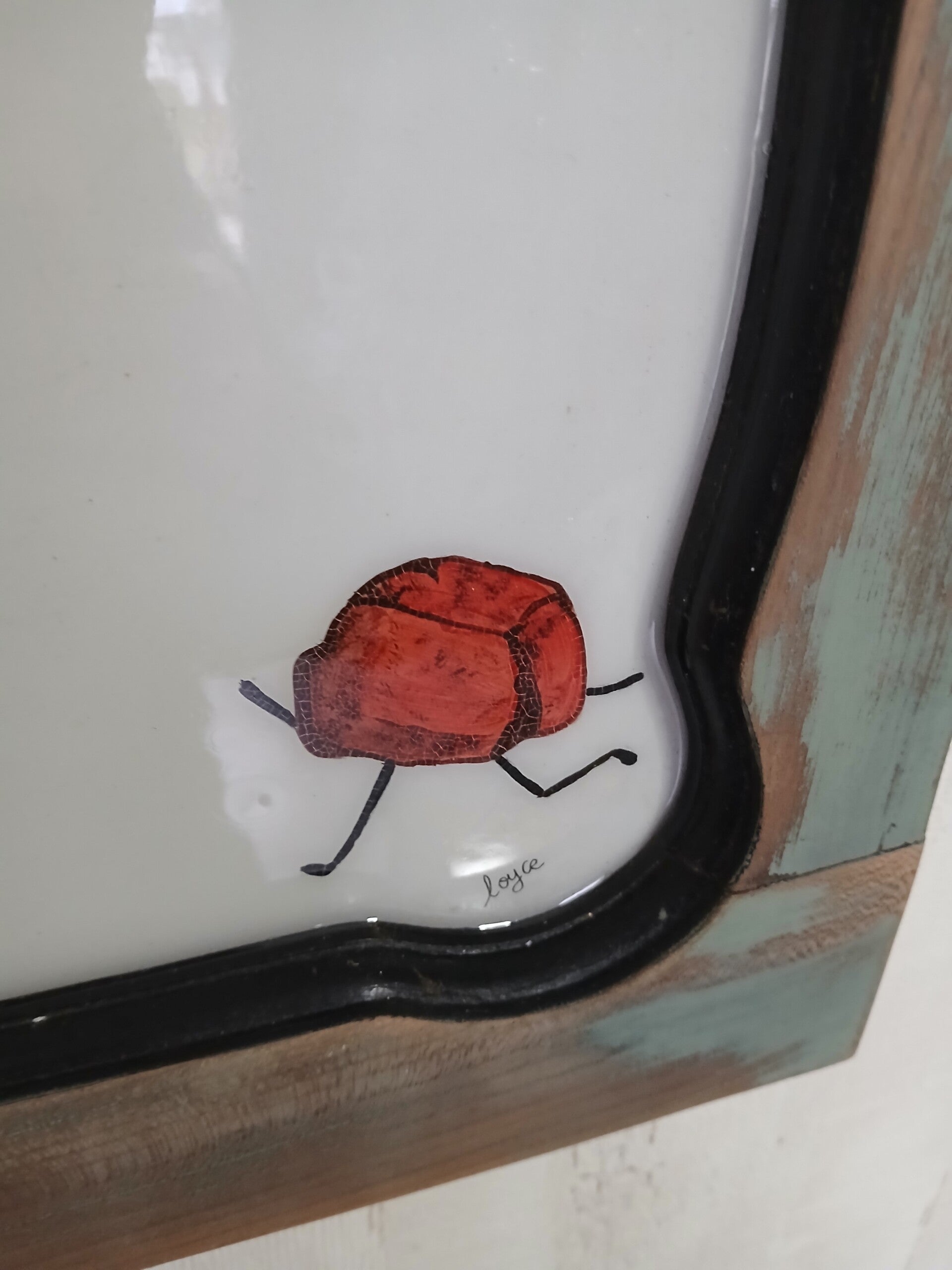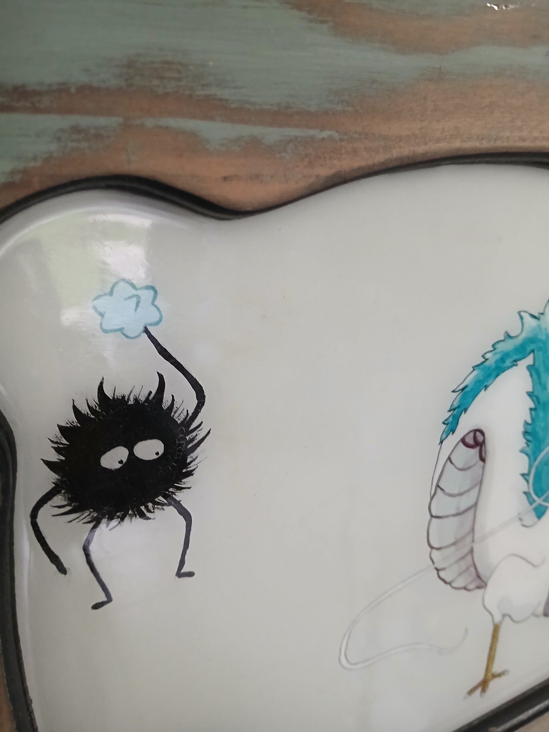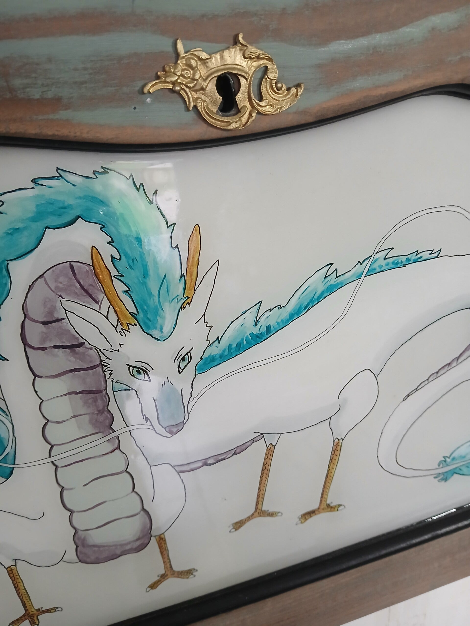 Vieille porte de meuble recyclée en tableau mural sur le thème 'le voyage de chihiro' est peinte à la main par une artiste Loyce Gribouille. Haku est mis en valeur sur fond blàc